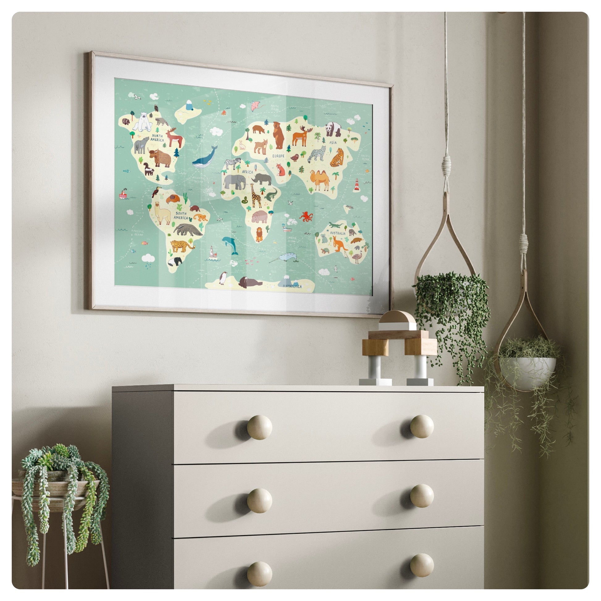 Animal world map print, animals, map, perfect for children’s bedroom, baby nursery, playroom, educational print